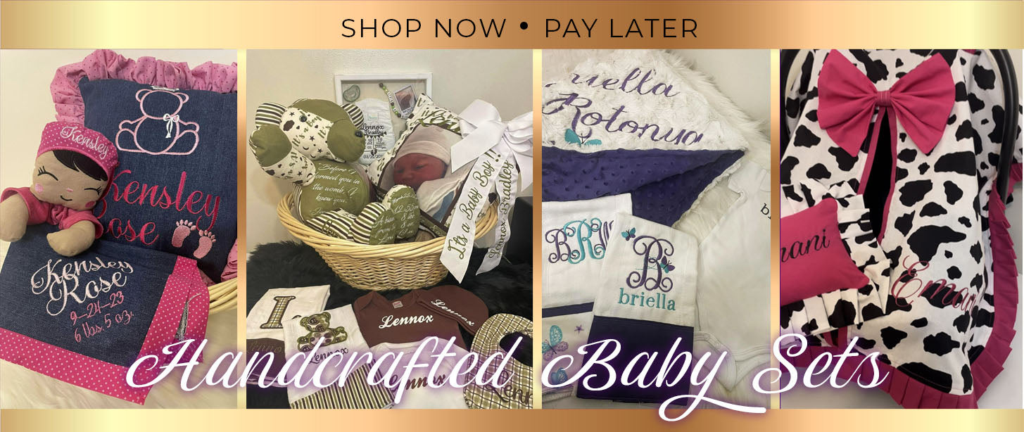 Celebrate new life with handcrafted baby items and gift sets, including custom embroidered onesies, bibs, burp cloths, blankets, stuffed balloons with plush baby items, and luxe baby shower gifts. Items may be personalized with a choice of beautiful embroidery or vinyl. Whether shopping for a baby shower, newborn photo session, or maternity ward, this collection wraps your love in every stitch.
